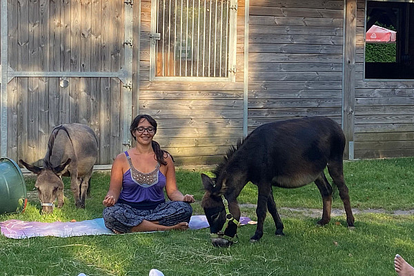 Frauen beim Esel-Yoga im Zündorfer Streichelzoo
