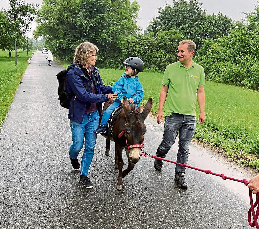 Lina singt. Auf dem Rücken der Eselin Waltraud sitzt die Fünfjährige mit aufgerichtetem Rücken, reitet einmal rund um das Gelände des Streichelzoos, strahlt ihre erwachsenen Begleiter an und ist sichtlich und hörbar mit ihrer Welt zufrieden. Ihr Reittier hat die Kleine mit Unterstützung von Tierpflegerin Martina selbst aus dem Stall geführt. Dann haben Lina und Logopädin Kerstin Deckstein das Grautier gestriegelt und mit Decke und Zaumzeug für den Ausritt parat gemacht. Bei alldem benennt die Pädagogin die einzelnen Arbeitsgeräte und Tätigkeiten, und Lina spricht ihr nach.