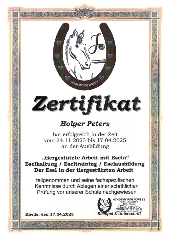 Holger Peters hat vom 24. November 2023 bis zum 17. April 2025 an der Ausbildung „Tiergestützte Arbeit mit Eseln – Der Esel in der tiergestützten Arbeit“ teilgenommen. Er hat gelernt, mit Eseln zu kommunizieren, ihr Wesen zu verstehen und sie feinfühlig in die Begleitung von Menschen einzubinden.