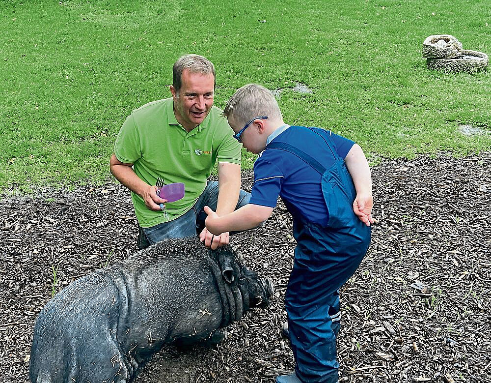Auch der siebenjährige Henri, ebenfalls vom Down-Syndrom betroffen, profitiert vom Intensivprojekt mit Vormittagen im Streichelzoo und späterer Vertiefung in der Sprachheilpraxis. Ehe es ans Reiten auf dem Esel geht, darf er mit Holger Peters Meerschweinchen, Kaninchen und das Minischwein „Schnitzel“ füttern. Heute hat der Junge sich das erste Mal allein getraut, dem schwarzen Schweinchen eine Möhre hinzuhalten und kurz über den borstigen Rücken zu streicheln. Mutig! Henri strahlt, seine Mutter und der Pädagoge freuen sich mit. „Kinder wachsen in der Begegnung mit Tieren über sich hinaus“, lobt Peters die Fortschritte und Mutter Ruth Grymel ist glücklich darüber, wie erzählfreudig ihr ältester Sohn geworden ist. „Das Schwein frisst Äpfel“, hat Henri seinen Brüdern berichtet. In der Schule werde ihm der Erfolg mit der ganzheitlichen Lernmethode aus der Streichelzoo-Woche sicher ebenfalls zugutekommen.
