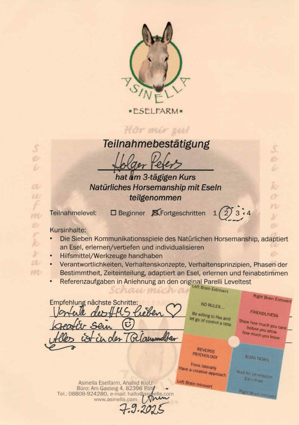 Diese Qualifikation bedeutet für mich vor allem eines: professionelle Weiterentwicklung, die meinen Eseln guttut – und damit auch allen Menschen, die ich in meiner tiergestützten Pädagogik begleite.